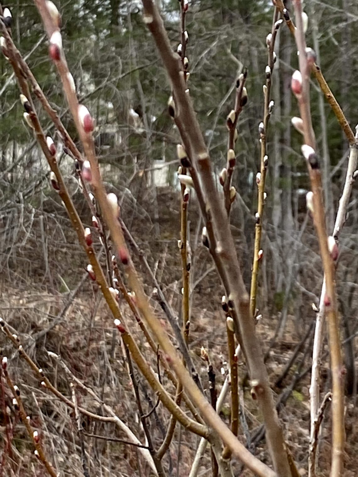 We just left the post office, when Louisa called me, “come here.” It had that hurry and see enthusiasm behind it. I grabbed my phone, photo op for sure and immediately thought it was going to be “babies”. I was expecting to approach quietly still thinking something was nesting nearby. There among the brown and mucky waters, with beige hues of grass mounds laid down from the winter snow was a scattering of twiggy bushes with tiny soft white pods, just beckoning. The tiniest of pussy willows. It was sheer delight to see. Spring for us is later than most areas. 3-4 weeks behind downstate. Emerging ever so slowly. I imagine the new life does not want to peek out only to be blasted by a cold front that can still descend upon us. But these little buds are an indicator of soon. A joyous sign for sure. Babies!